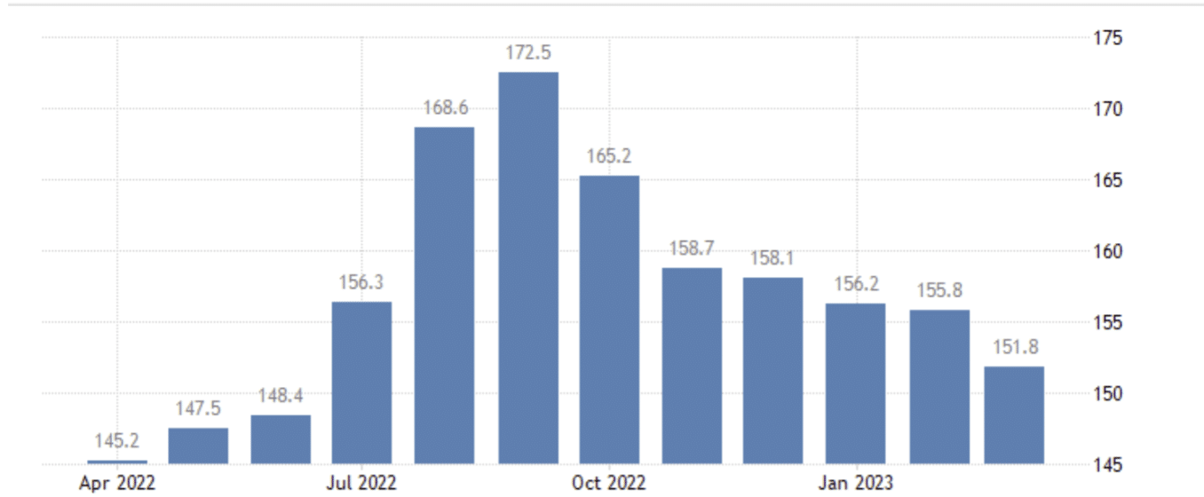 May 19 15:00 JPT; 06:00 GMT, ドイツの生産者物価は、2023年2月の155.80ポイントから3月は151.80ポイントに低下しました。