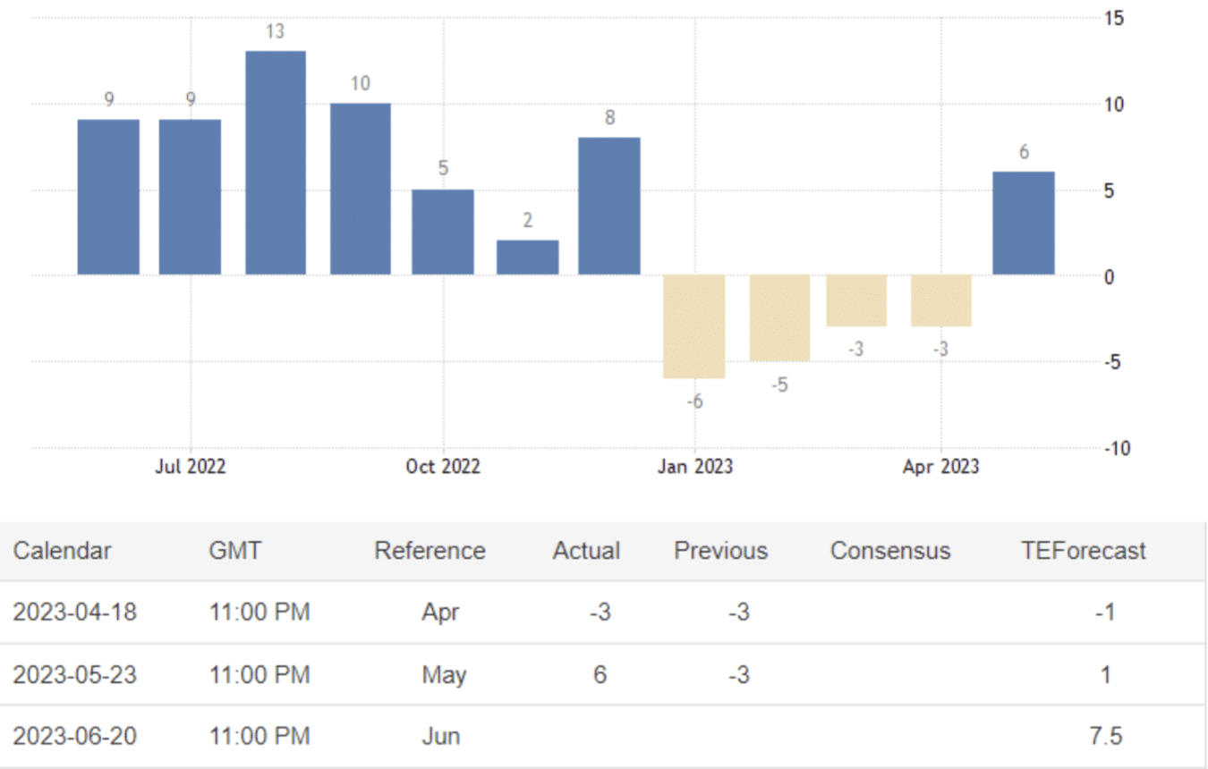 May 24 08:00 JPT; 23:00 GMT, 2023 年5 月の日本の製造業を対象としたロイター短観は、4 月の-3 から+6 に急上昇し、COVID による景気減速からの回復を背景に今年初めてプラスに転じました。