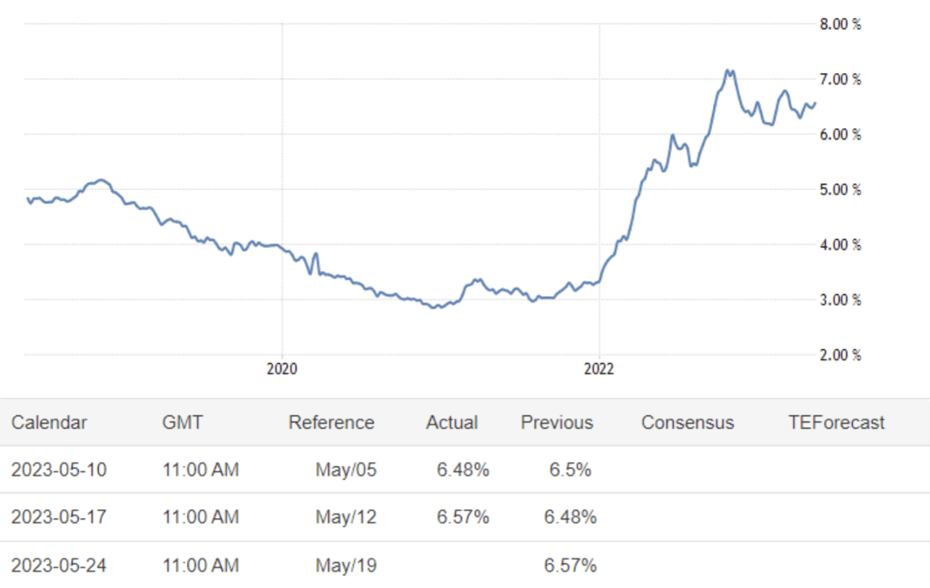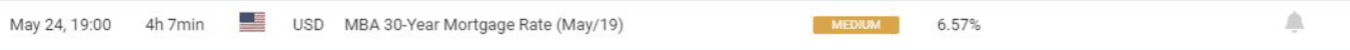 May 24 20:00 JPT; 11:00 GMT, 米国のコンフォーミングローン残高(726,200 ドル以下)の30年固定金利住宅ローンの平均契約金利が9bps 上昇して6.57%となり、2 ヶ月ぶりの高水準となったことが、住宅ローン銀行協会のデータで明らかになりました。