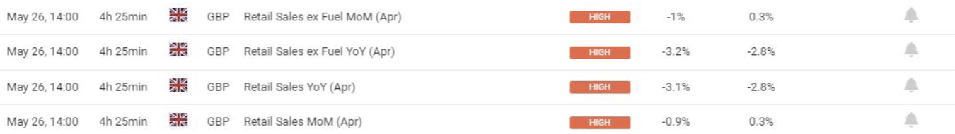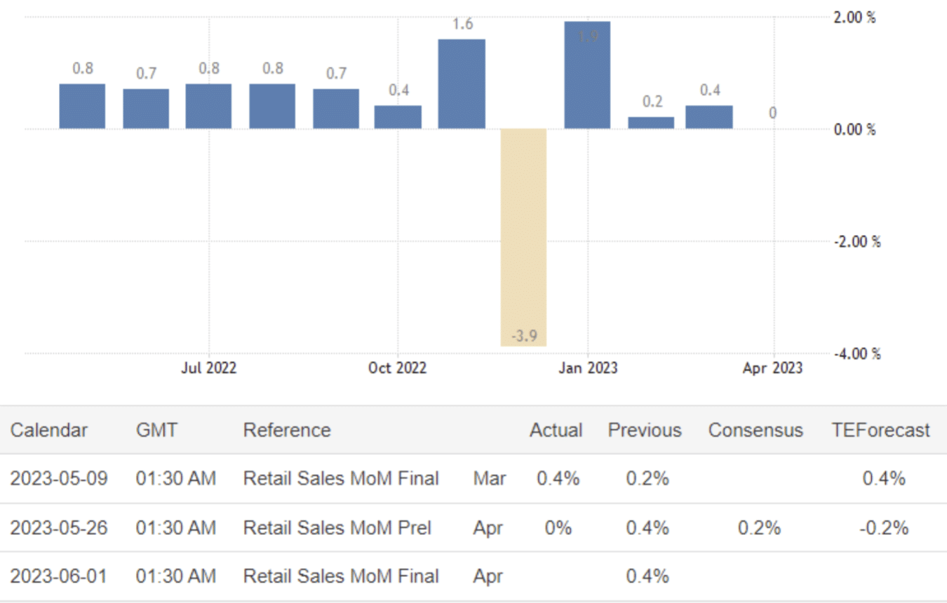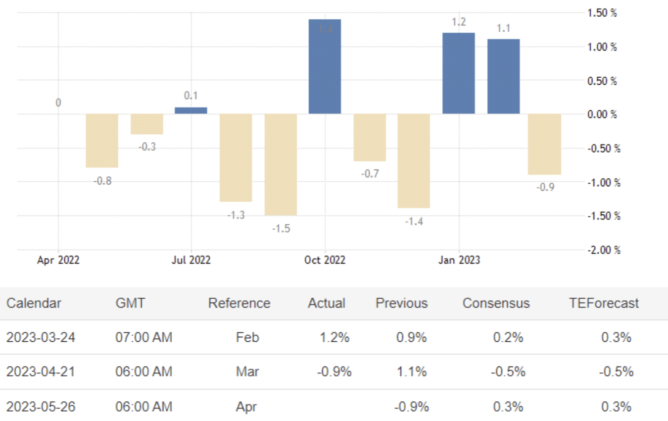 May 26 15:00 JPT; 06:00 GMT, 2023年3月の英国の小売売上高は、前月の1.1%の下方修正に続き、市場予想の0.5%減に比べ0.9%減となりました。