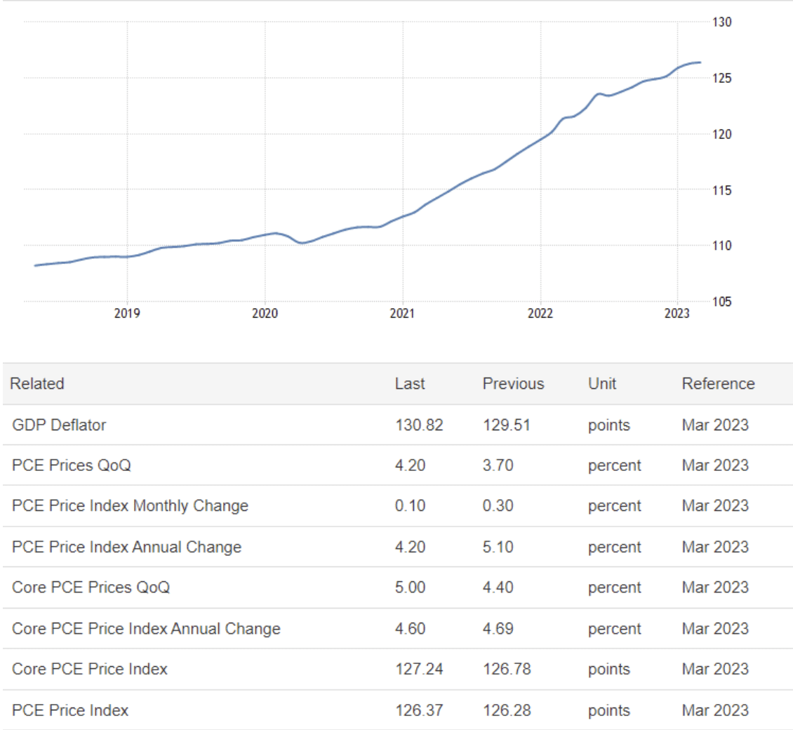 May 26 21:30 JPT; 12:30 GMT, 米国のPCE価格指数は、2023年2月の126.28ポイントから3月には126.37ポイントに上昇しました。