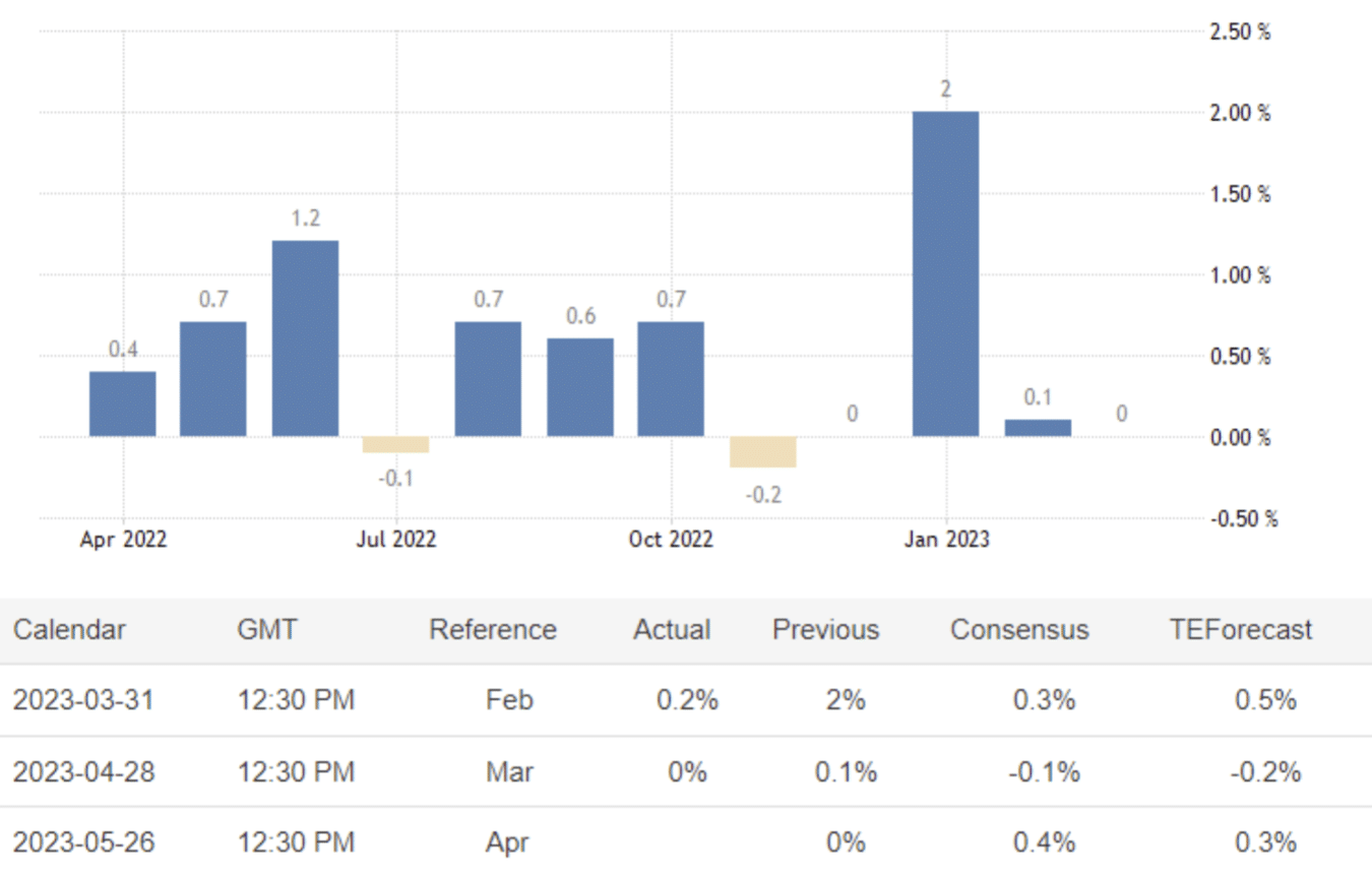 May 26 21:30 JPT; 12:30 GMT, 2023年3月の米国の個人消費は、2月の0.1%増という下方修正に続き、前月から横ばいとなりました。この伸び悩みは、高止まりするインフレ率や借入コストの増加など、いくつかの要因が個人消費の重荷になっているためと思われます。サービス消費は、住宅、光熱費、医療サービスに対する支出の増加により、0.4%増加しました。一方、財の消費は、自動車および部品、ガソリンおよびその他のエネルギー財への支出の減少に牽引され、0.6%の減少となりました。
