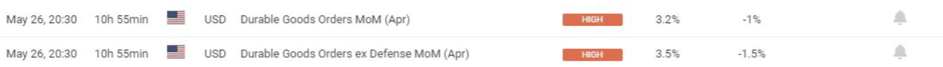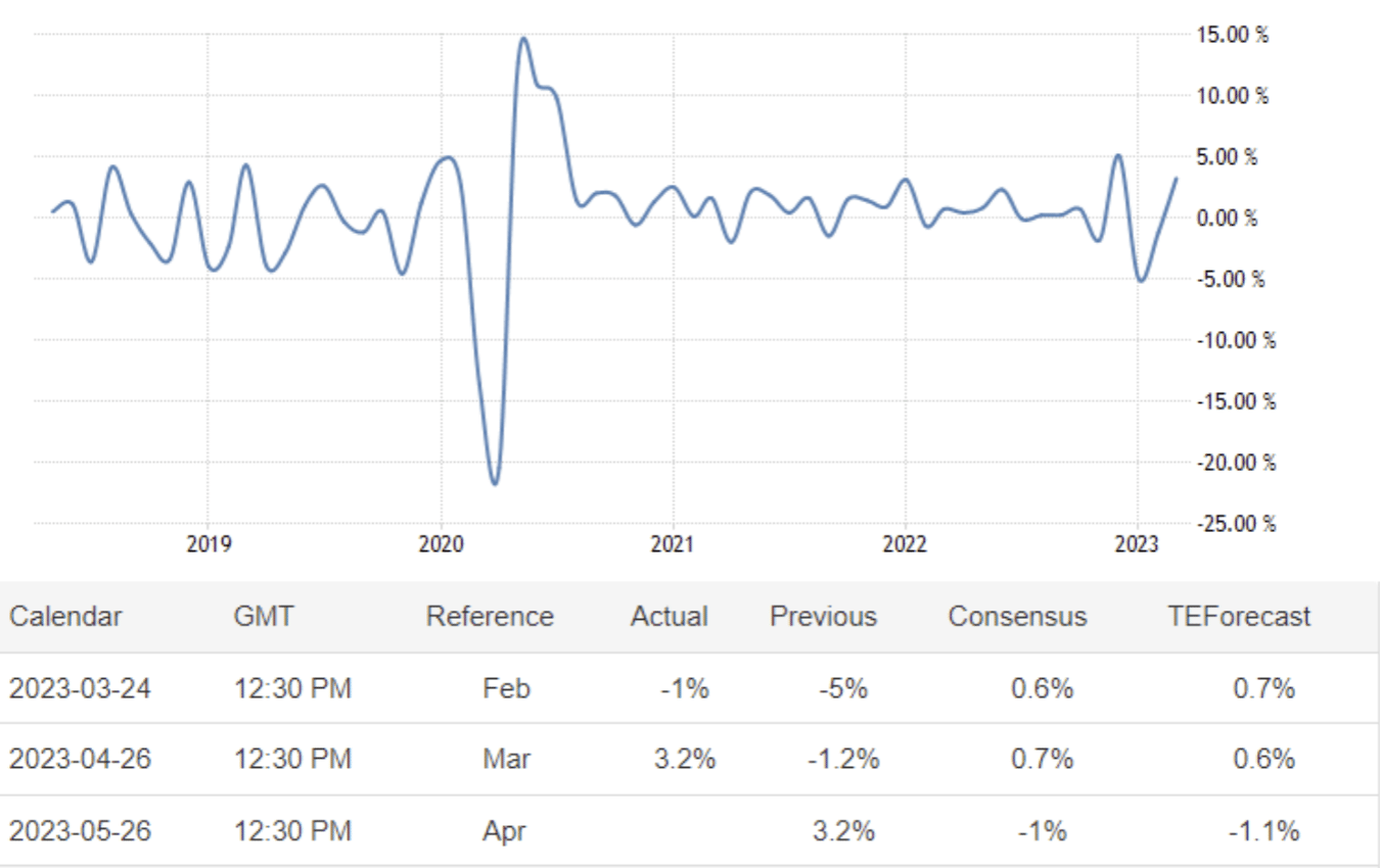 May 26 21:30 JPT; 12:30 GMT, 2023年3月の米国製造耐久財の新規受注は前月比3.2%増となり、2月の改定値1.2%減から回復し、市場予想の0.7%増をあっさり上回りました。企業の支出計画の代理として注目される航空機を除く非国防資本財の受注は、前月の0.7%減に続き、3月も0.4%減となっています。