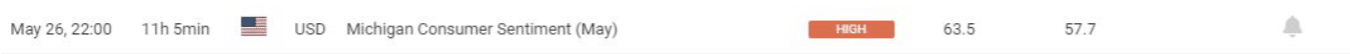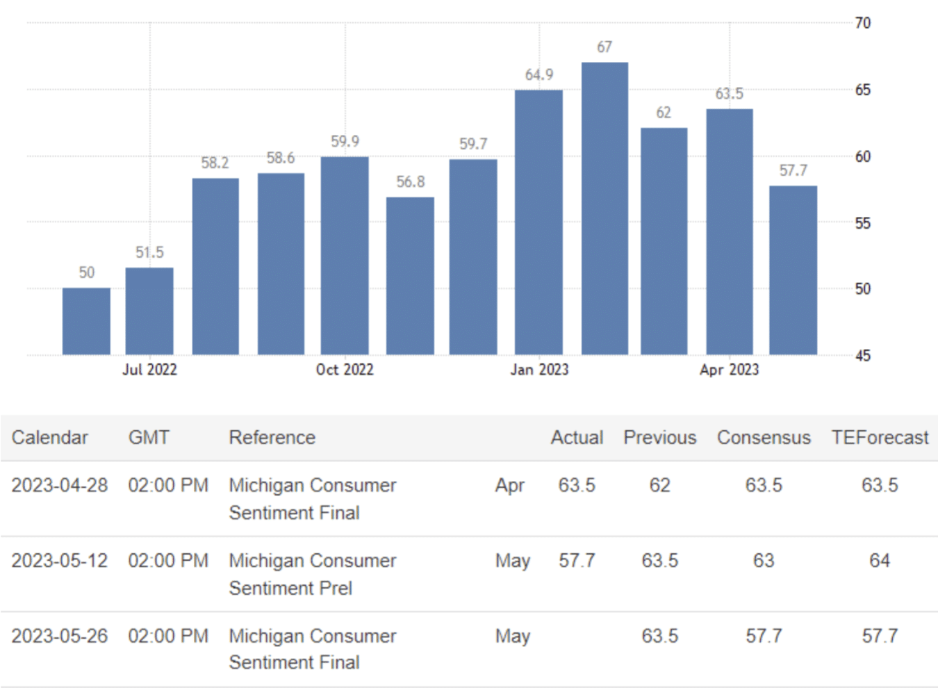 May 26 23:00 JPT; 14:00 GMT, 米国ミシガン大学の2023年5月の消費者心理は、経済の軌道に対する懸念が再燃する中、予想の63.5を大きく下回り、4月の63.5から57.7と6カ月ぶりの低さに急落したことが、速報値で明らかになりました。