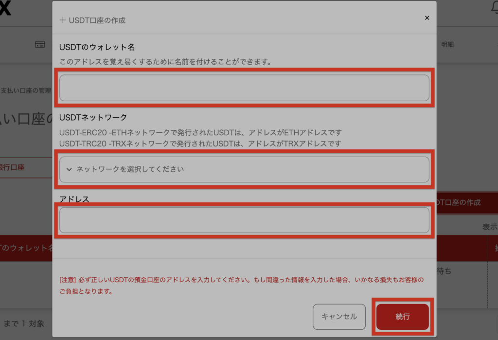 対象のポップアップにてご使用のUSDT口座情報を入力して【続行】をクリックしてください。
