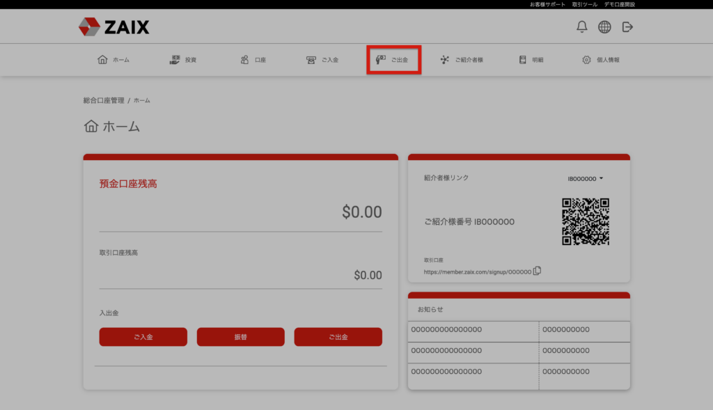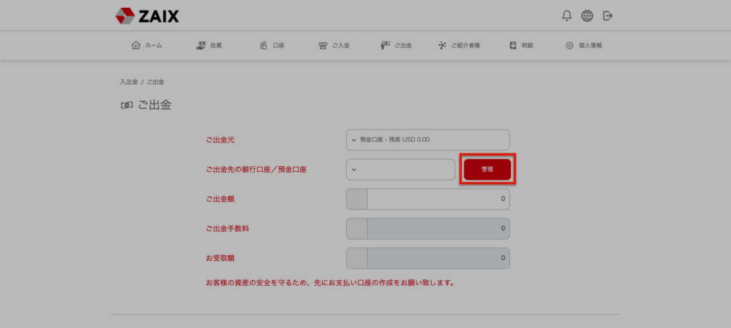 メニューにて「ご出金」をクリックすると出金ページに移動いたします。