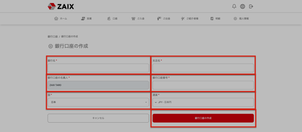 口座登録フォームへの入力は画像下記の表を参考に入力してください。