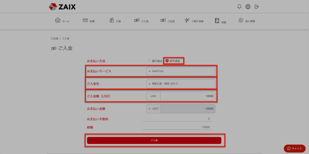 「ご入金(USD)」に金額を入力をしていただくと「お支払い金額」に日本円での入金額が表示されます。