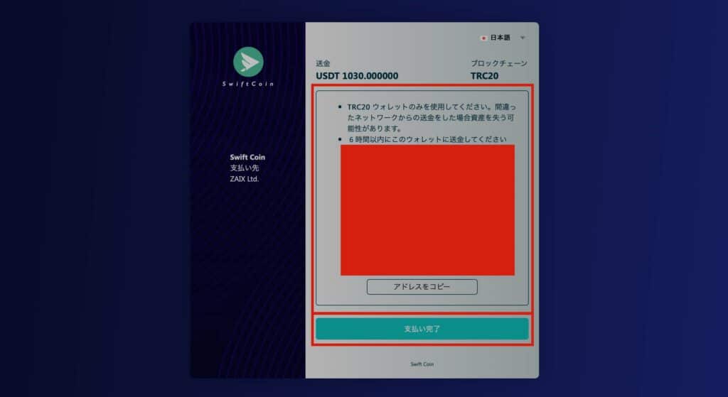 対象のページにて表示されているQRコードかUSDTアドレスをコピーして、左上に表示されている金額を送金してください。
