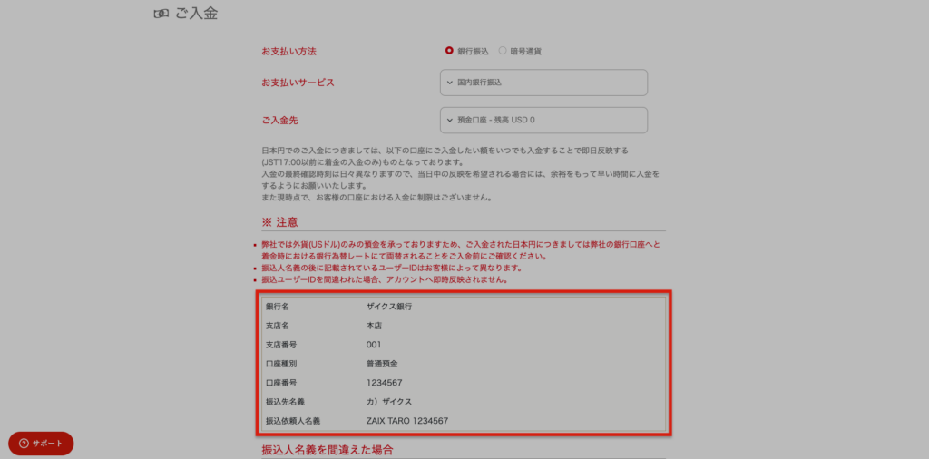 ※お振込を行う際につきましては、振込名義人の後に記載されているユーザーIDを入力するようお願い致します。振込依頼人名義を間違えた場合におきましてはアカウントへ即時反映しないか、お客様ご自身で組み戻し手続き等を行っていただく必要がございます。