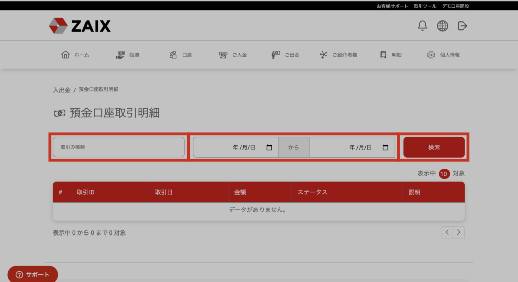 上記2つを選択していただき、検索ボタンをクリックしていただくことで取引明細が表示されます。