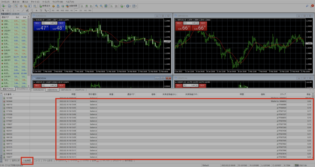 MT4で収益はどのように確認できますか? MT4での収益確認は、投資商品をご利用いただいたのちに確認可能でございます。投資商品の運用方法はこちらのページをご参照ください。 また、MT4のログイン方法はこちらのページに記載しております。 PC版 PC版ではMT4にログインしていただき、下のメニューにある「口座履歴」を選択することで、収益の結果が閲覧可能でございます。