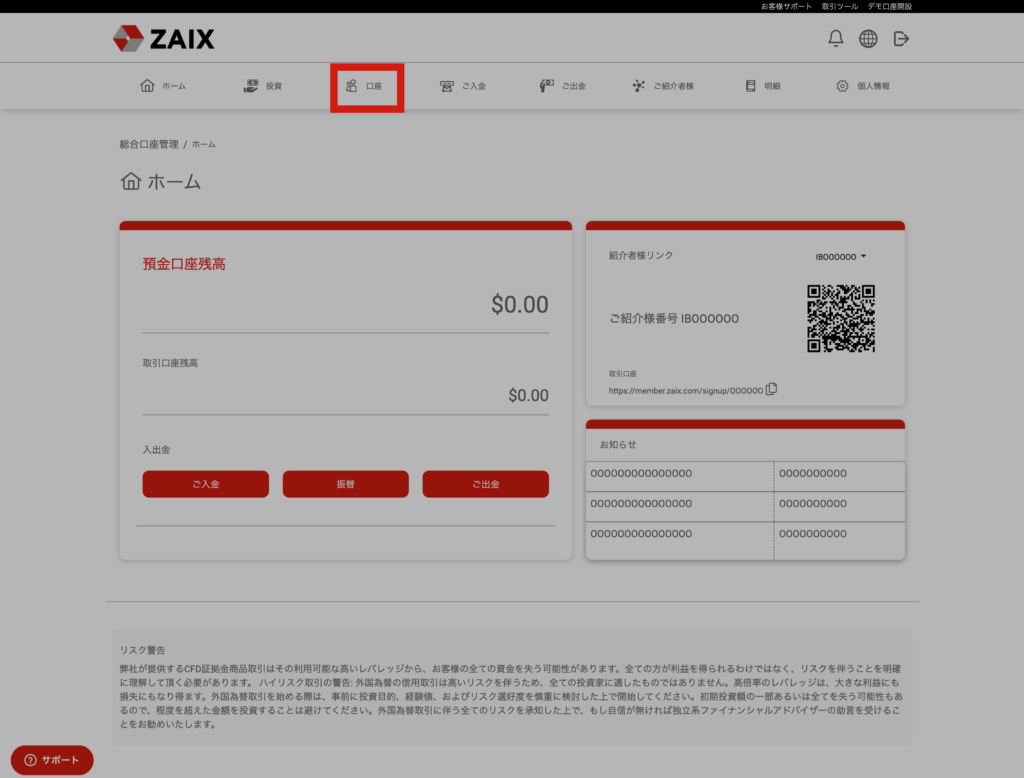 メニューにて「口座」をクリック、その下に表示されるドロップダウンメニューにて「取引口座」を選択すると取引口座一覧ページへと移動します。