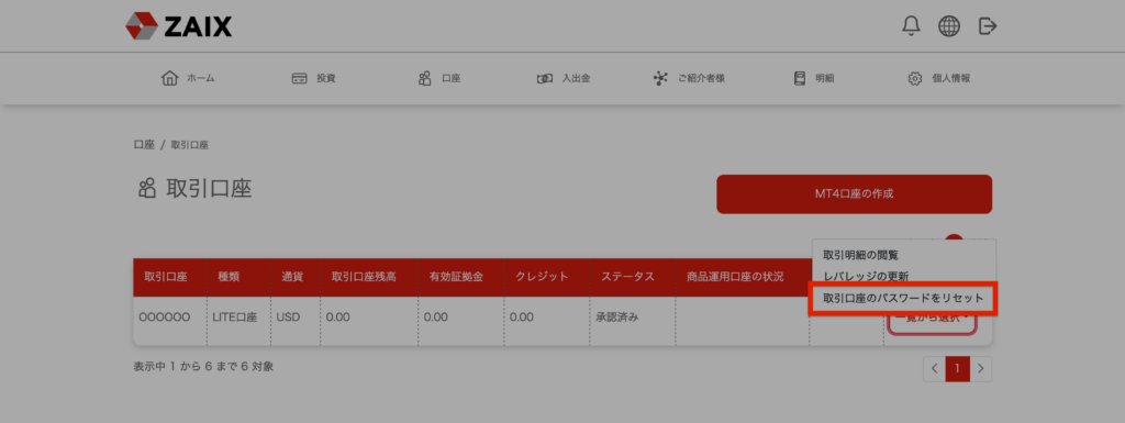 取引口座のパスワードのリセットは、対象アカウントの右側にある「一覧を選択」をクリックし、下の画像のドロップダウンメニューにて「取引口座のパスワードをリセット」をクリックしていただくことで、パスワードのリセットが行われます。