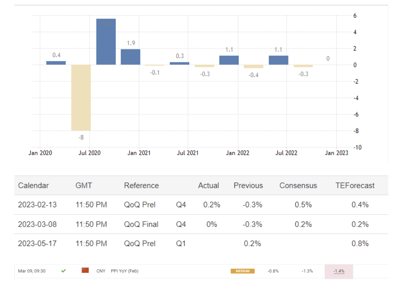 Mar 09 08:50 JPT; 23:50 GMT, 2022 年 12 月までの 3 ヵ月間の日本経済は、速報値の0.2%増に 対し、前期は 0.3%減となり、前四半期比で停滞しています。