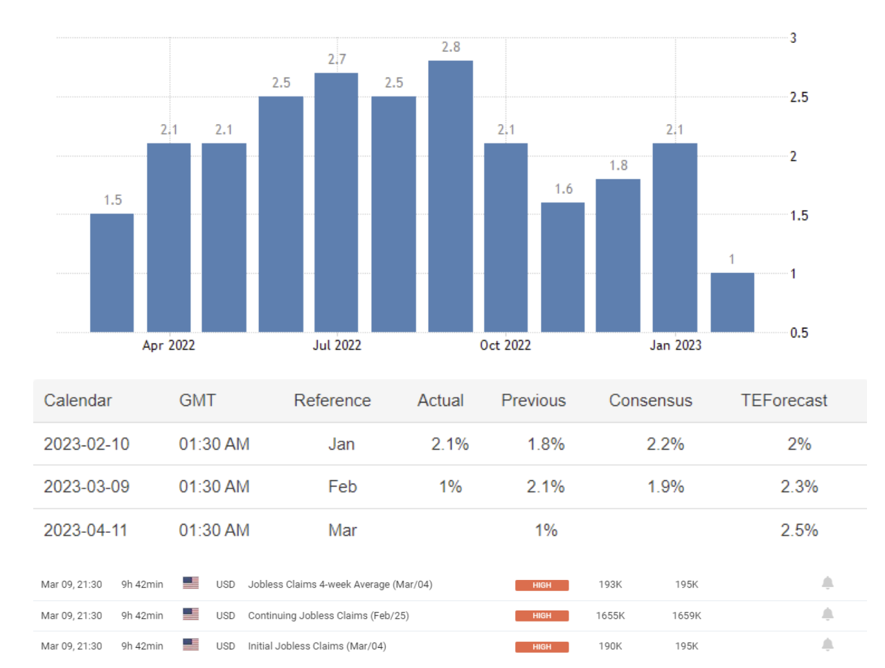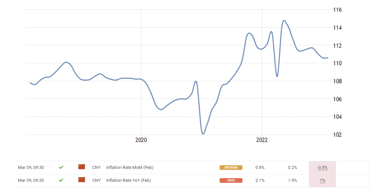 Mar 09 10:30 JPT; 01:30 GMT, 中国の 2023 年 2 月の年間インフレ率は、前月の 2.1%から 1.0%に低下し、市場予想の 1.9%を下回りました。