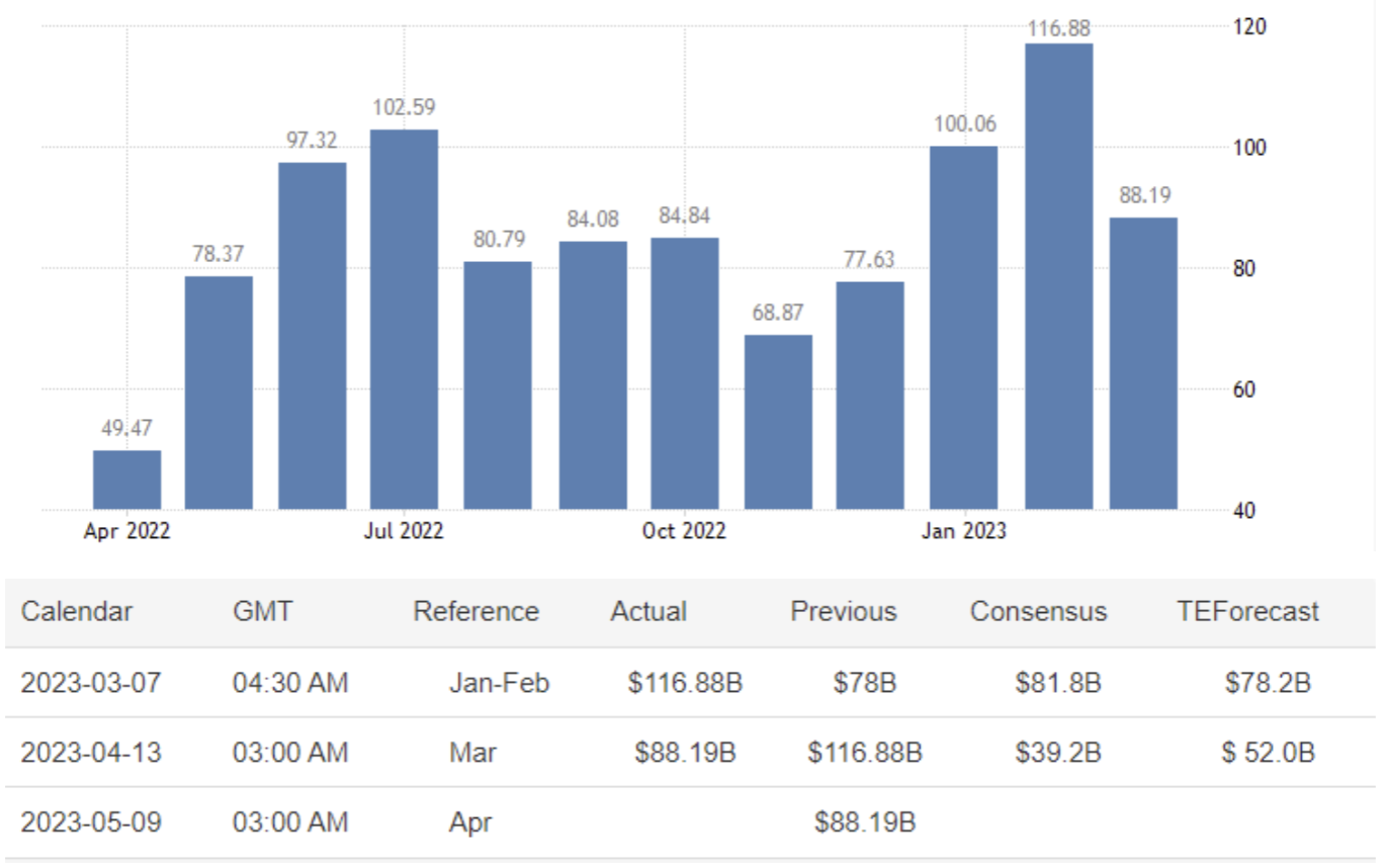 April 13 12:00 JPT; 03:00 GMT, 中国の貿易黒字は、前年同期の443.5億米ドルから2023年3月には881.9億米ドルに拡大し、市場予想の392億米ドルをあっさり上回りました。