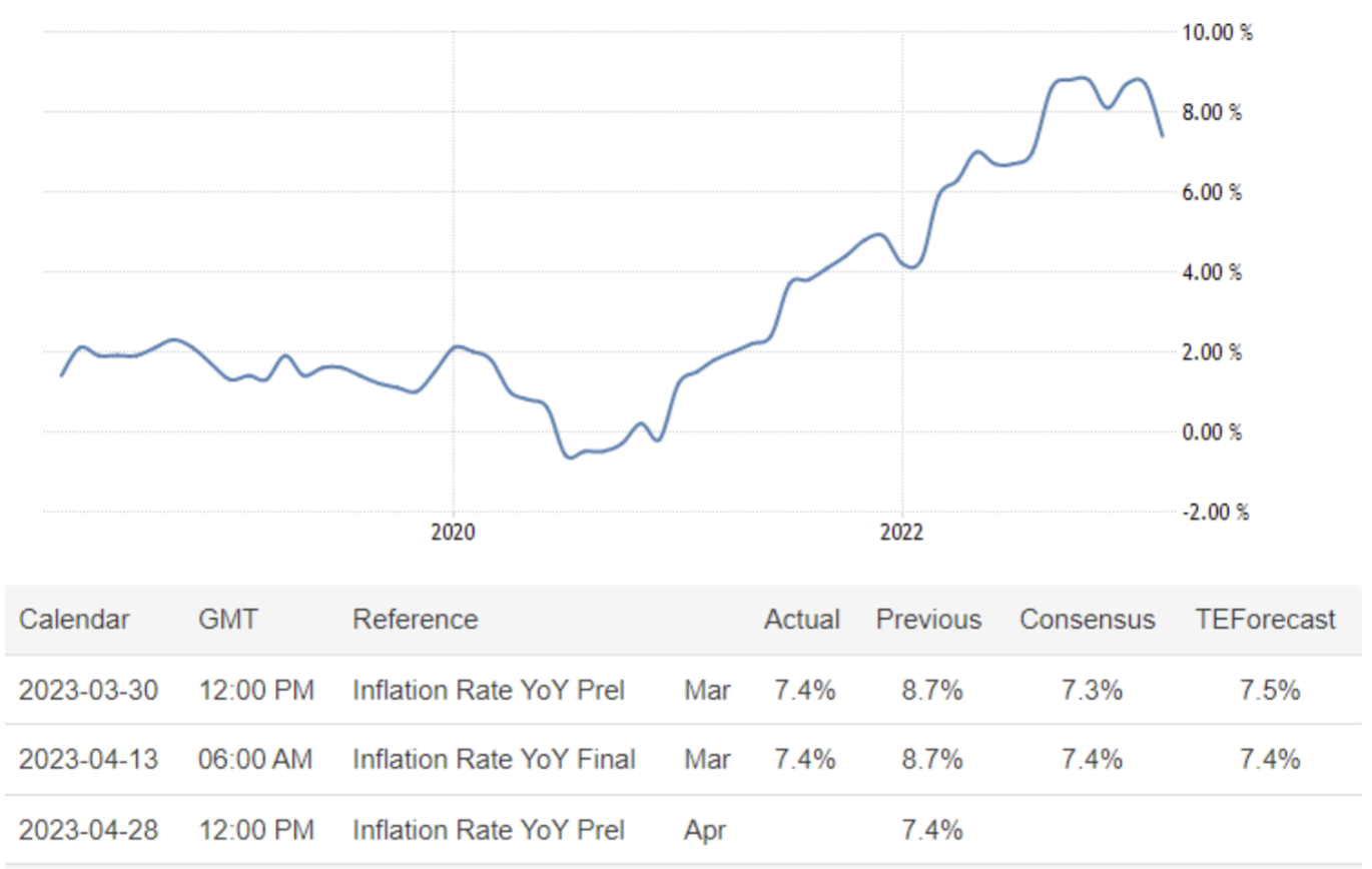 April 13 15:00 JPT; 06:00 GMT, 2023年3月のドイツの消費者物価上昇率は、前年同月比7.4%と7ヵ月ぶりの低水準を確認し、前々月の8.7%から低下、欧州中央銀行が目標とする2%程度を大きく上回る水準で推移しました。