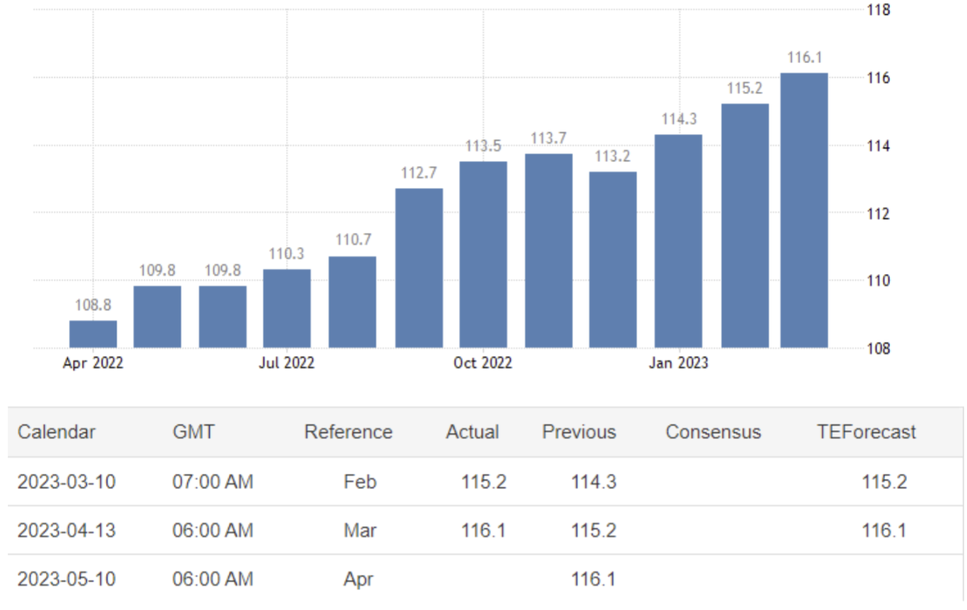 April 13 15:00 JPT; 06:00 GMT, ドイツの消費者物価指数(CPI)は、消費者が購入する財やサービスの価格の変化を測定するものです。ドイツの消費者物価指数CPIは、2023年2月の115.20ポイントから3月に116.10ポイントに上昇しました。